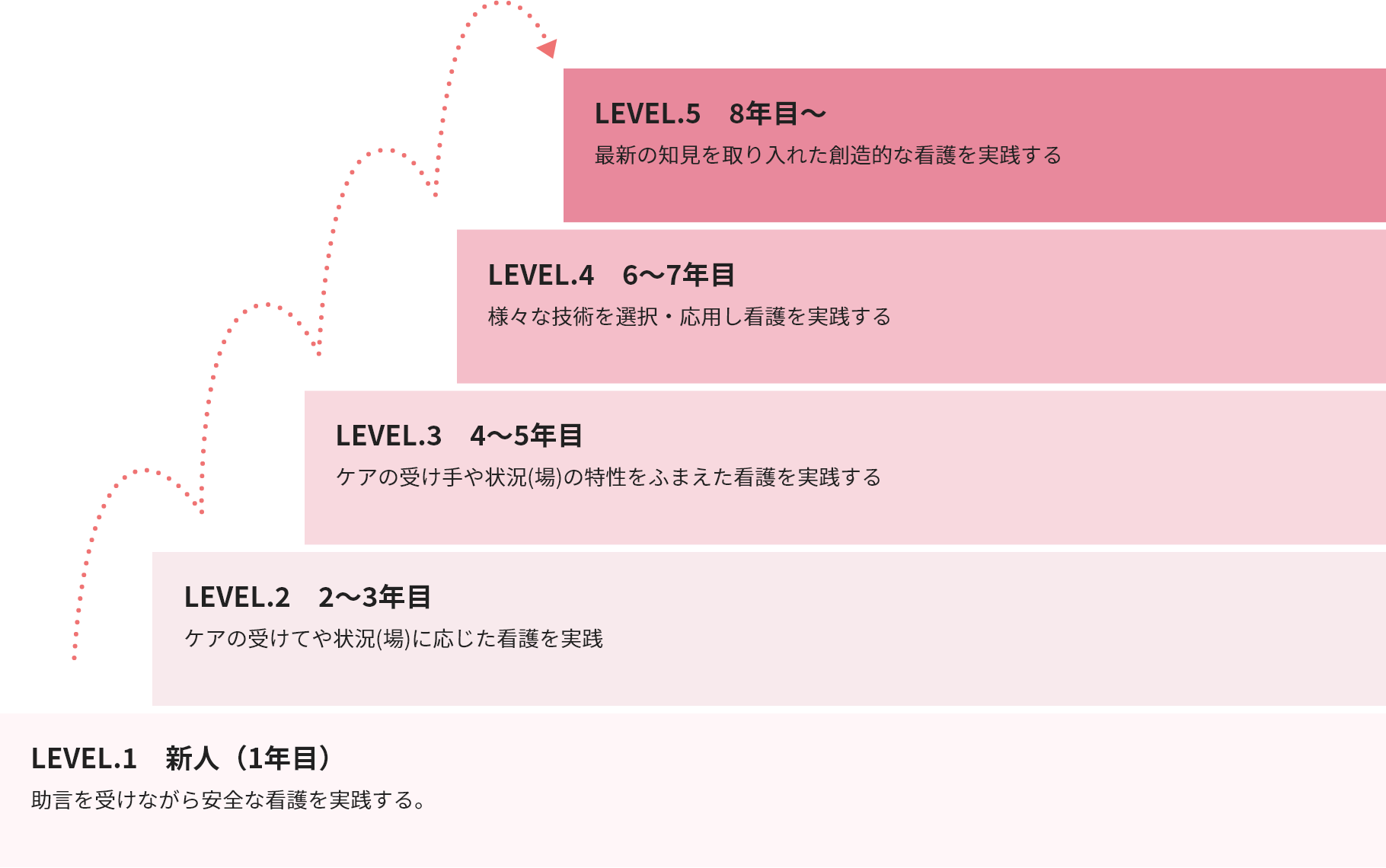 看護師として必要な技術・知識・態度が段階を追って身につくよう、個々の能力にあわせた教育をクリニカルラダーシステムで行っています。看護への夢や希望を実現し、ナースとして一人前になるために必要な教育体制を準備しています。